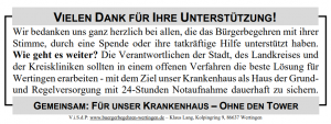 Die Bürgerinnen und Bürger Wertingens haben entschieden. Deutlicher als von vielen erwartet! Die Bürgerinitiative „Für unser Krankenhaus – Gegen den Tower“ hatte als Bevollmächtigte von den Unterzeichnern des Bürgerbegehrens den Auftrag, den Bürgerentscheid zu ermöglichen. Mit der für ein solches Verfahren hohen Wahlbeteiligung, der deutlichen Mehrheit für das Bürgerbegehren und der gleichmäßigen Zustimmung aus dem gesamten Gebiet der Stadt und der Stadtteile haben die Wertingerinnen und Wertinger diesen Auftrag eindrucksvoll unterstützt. Ganz herzlich danken wir allen, die zum Erfolg des Bürgerbegehrens mit ihrer Stimme, durch eine Spende oder ihre tatkräftige Hilfe beigetragen haben. Mit der Entscheidung der Bürgerinnen und Bürger wurde in einem demokratischen Verfahren der Beschluss vom 21. Oktober 2020, in dem der Stadtrat dem Tower-Projekt eines privaten Investors „grünes Licht“ gab, aufgehoben. Der Bürgerwille ist eindeutig: Wertingen will an dieser Stelle keinen 11‑stöckigen privaten Turm, der überwiegend medizinfremd genutzt wird. Zugleich ist es ein Signal an die für die Klinik Verantwortlichen, die Entwicklung des Krankenhauses keinen Risiken auszusetzen. Wir haben sachlich dargestellt, welche Probleme mit dem Bau des geplanten Towers verbunden sind. Alternativ wurden auf unserer Homepage bereits vor Monaten der Ablauf, wie er bei derartigen Bauvorhaben üblich ist, aufgezeigt und beispielhaft andere Lösungsmöglichkeiten dargestellt. Für weitere Informationen verweisen wir auf: www.buergerbegehren-wertingen.de. Aus parteipolitisch motivierten Diskussionen haben wir uns herausgehalten. Der übertragene Auftrag nach dem Gesetz über Bürgerbegehren ist erfüllt und die Arbeit der Initiative damit vorerst beendet. Jetzt sollten die Verantwortlichen der Stadt, des Landkreises sowie der Kreiskliniken GmbH in gemeinsamer Diskussion und einem offenen Verfahren Lösungen für Wertingen und seine Bürgerinnen und Bürger erarbeiten mit dem gemeinsamen Ziel, unser Krankenhaus als Haus der Grund- und Regelversorgung mit 24-Stunden-Notaufnahme zu erhalten und dauerhaft zu sichern. (pm)